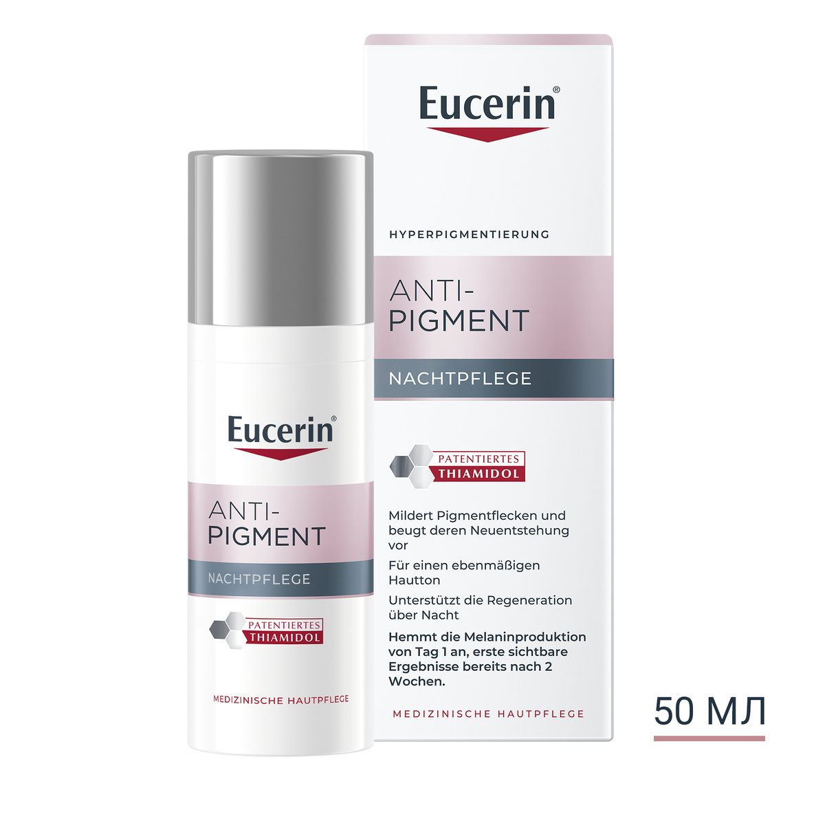 Eucerin Anti-Pigment Night містить Thiamidol, ефективний запатентований інгредієнт, який впливає на першопричину гіперпігментації, зменшуючи вироблення меланіну. Клінічно й дерматологічно доведено: він зменшує темні плями й запобігає їхній повторній появі. Перші результати помітні через два тижні й постійне покращення тону шкіри — за регулярного застосування.