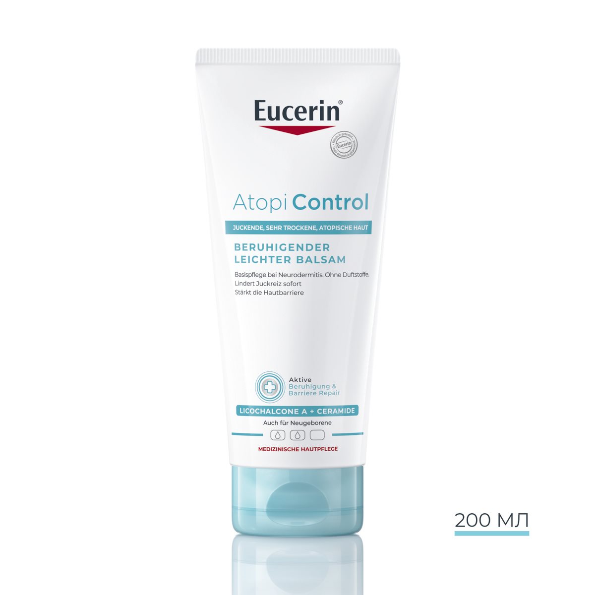Бальзам Eucerin AtopiControl — це засіб для щоденного використання, спеціально розроблений для заспокоєння та інтенсивного зволоження подразненої та сверблячої шкіри. Він збагачений заспокійливим лікохалконом А, керамідами та жирними кислотами Омега-6 для зміцнення захисного бар’єру шкіри, усунення сухості та свербіння.