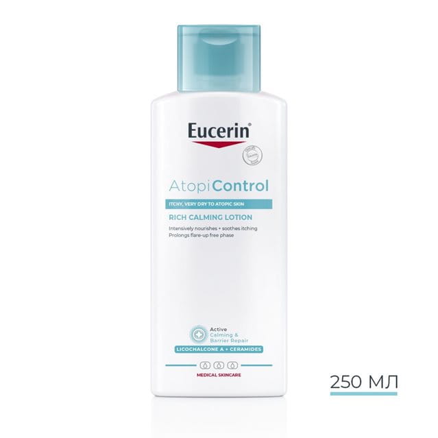 У лосьйоні для атопічної шкіри тіла Eucerin AtopiControl використана комбінація концентрованих Омега - 6 - жирних кислот (Олія примули вечірньої та Олія виноградного насіння) і пом'якшувального Лікохалкона А (екстракт кореня солодки) для поповнення шкіри, допомагає відновити природний бар'єр та робить її більш пружною. Наносити один раз або двічі на день або як додатковий засіб до Інтенсивного заспокійливого крему для атопічної шкіри в період загострення Eucerin AtopiControl для догляду під час загострень.