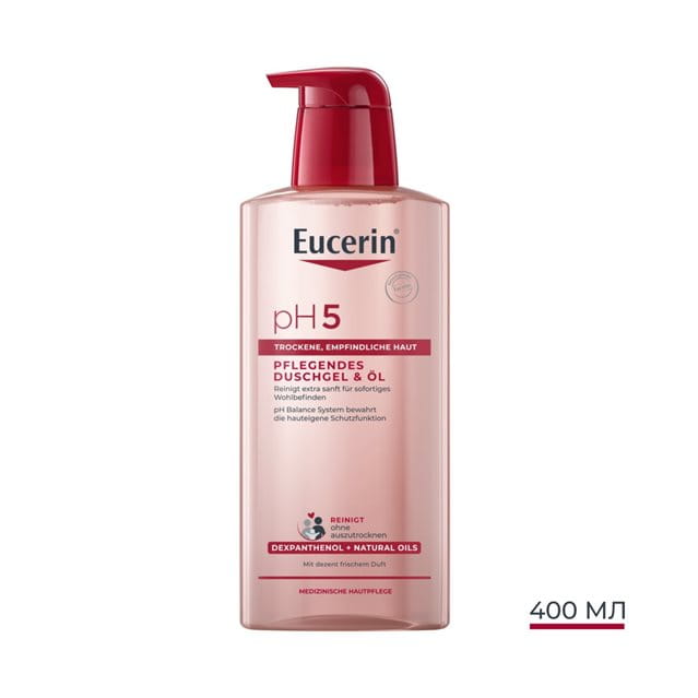 Збагачений Декспантенолом і Натуральними оліями, "pH5" Делікатний гель для душу з живильними оліями, ніжно та ефективно очищає чутливу шкіру та захищає від пересихання. Його м’яка формула з системою pH Eucerin Balance System підтримує ідеальний рівень pH шкіри та зміцнює її природний захисний бар’єр. Має ніжний свіжиий аромат.