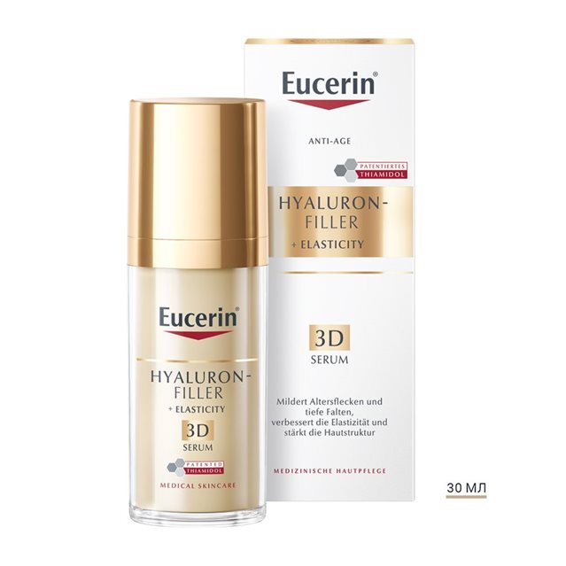 Клінічно та дерматологічно доведено, що потрійна 3D-сироватка Hyaluron-Filler + Elasticity від Eucerin зменшує вікові плями, помітно розгладжує глибокі зморшки, покращує еластичність, робить шкіру сяючою та омолодженою.