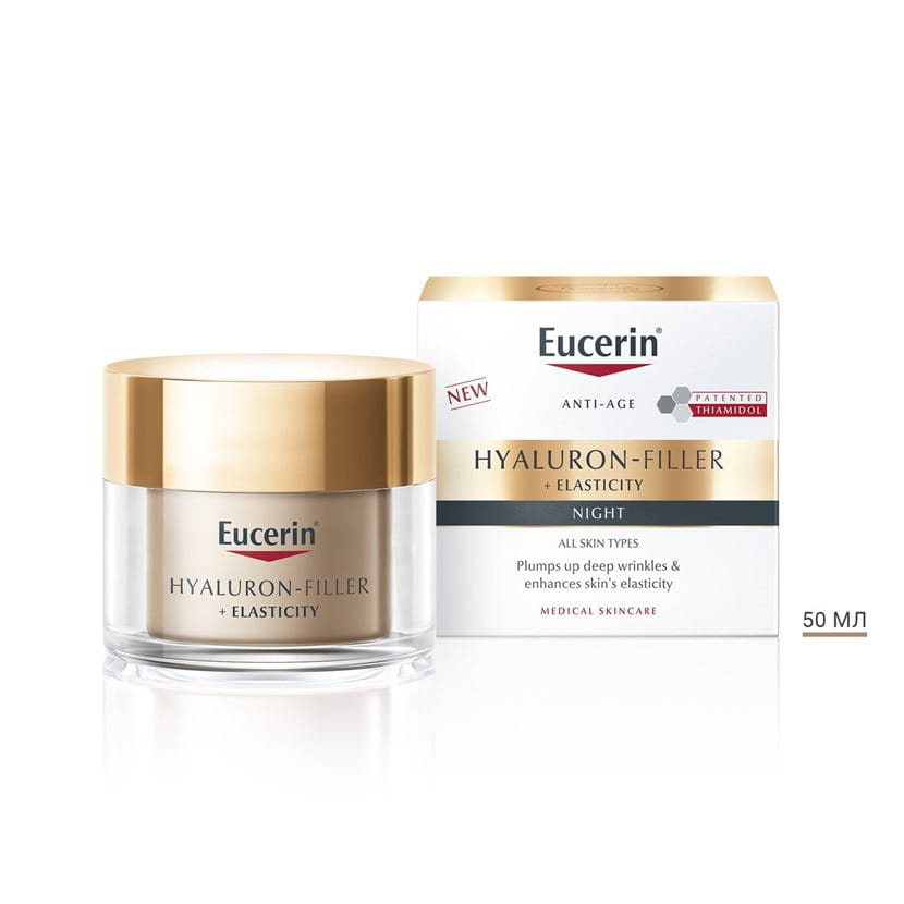 Eucerin Hyaluron-Filler + Elasticity Night — ефективний засіб проти ознак старіння, який розгладжує глибокі зморшки, покращує еластичність шкіри та зменшує вікові плями.