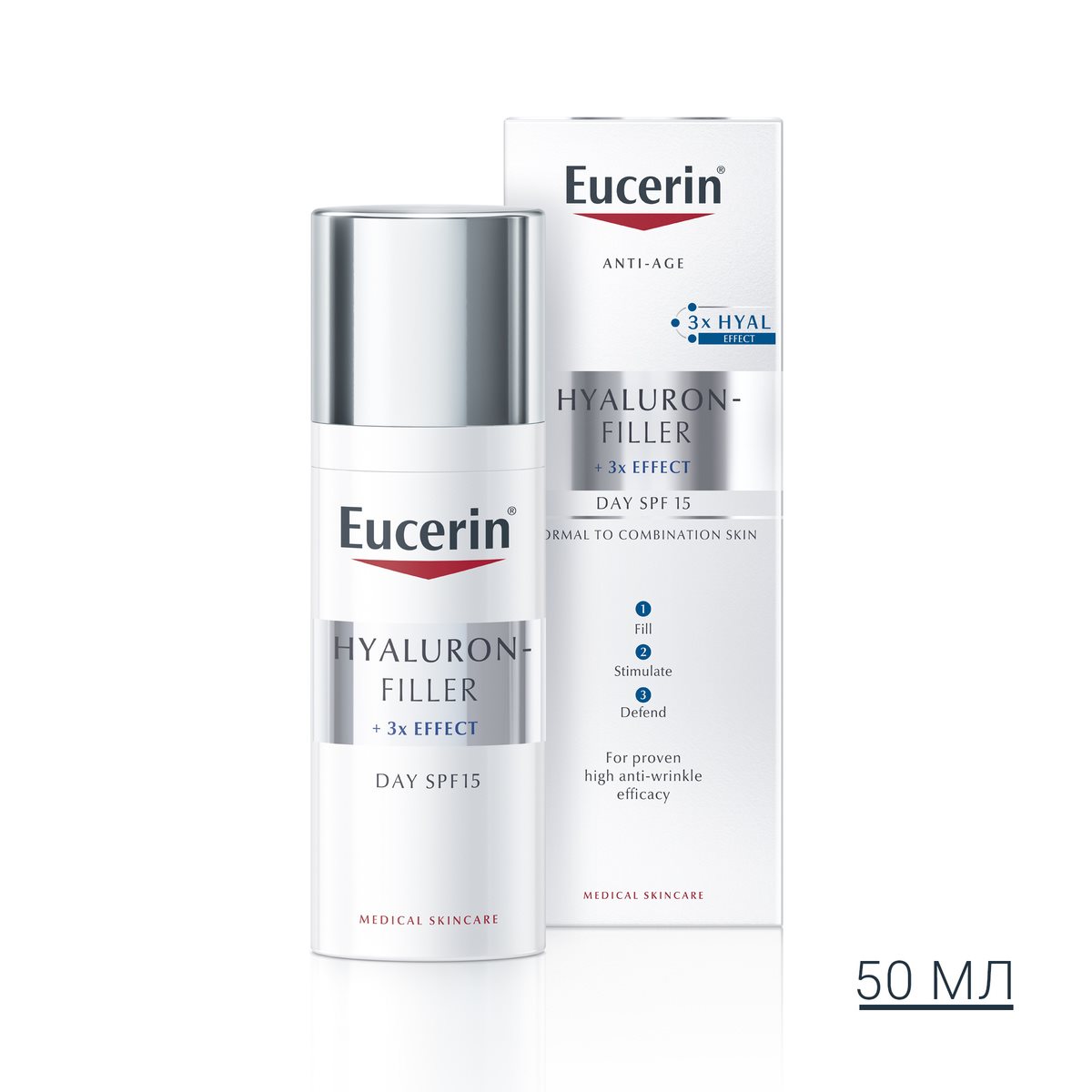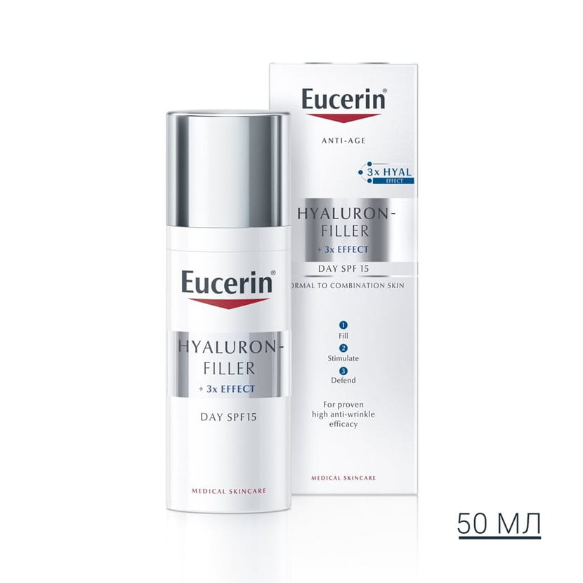 Лінійка Eucerin Hyaluron-Filler +3x Effect спеціально розроблена для боротьби з першими ознаками старіння — тонкими лініями та зморшками, які зазвичай з’являються після 30 років через вплив генетики та способу життя. "Гіалурон-Філлер" легкий крем проти зморшок для нормальної та комбінованої шкіри з SPF15 — це зволожувальний засіб із високо- й низькомолекулярною Гіалуроновою кислотою. Він глибоко зволожує шкіру й помітно наповнює зморшки, забезпечуючи довготривалий антивіковий ефект.