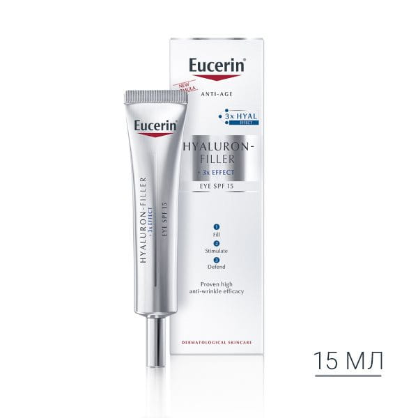 Крем Eucerin Hyaluron-Filler Eye з SPF 15 бореться з першими ознаками старіння в делікатній зоні навколо очей. Він помітно розгладжує тонкі лінії та навіть глибокі зморшки, і захищає шкіру від передчасного старіння, спричиненого сонячними променями.
