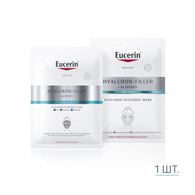 "Гіалурон-Філлер" Інтенсивна маска з гіалуроновою кислотою від Eucerin - клінічно та дерматологічно доведено, що вона забезпечує негайну гідратацію та зменшує появу тонких ліній зморшок. Покращує шкіру на вигляд, надає відчуття зволоженості, свіжості, сяяння та омолодження. Ідеально підходить, коли ваша шкіра виглядає втомленою або напруженою.