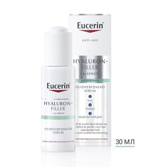 Антиоксидантна сироватка Hyalluron-Filler усуває перші ознаки старіння та звужує пори. Цей ультралегкий засіб містить три основні активні речовини: гіалуронову, гліколеву й молочну кислоту, які роблять шкіру шовковисто-гладкою. Формула з антиоксидантами також захищає шкіру від вільних радикалів і шкідливого впливу навколишнього середовища. У дослідженні 97% респондентів підтвердили, що шкіра стає гладкою; 88% погодилися, що розгладжуються тонкі зморшки; а 91% сказали, що після використання антиоксидантної сироватки Eucerin Hyaluron-Filler не з’являється жирний блиск. Сироватка підходить для шкіри з першими ознаками старіння, такими як тонкі зморшки, розширені пори, огрубіла або тьмяна шкіра. Ультралегка й нежирна текстура робить цю сироватку чудовим засобом для власників жирної шкіри, а також підходить для нанесення під макіяж.