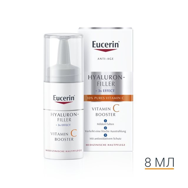 Eucerin Hyaluron - Filler Вітамін С Бустер підходить для всіх типів шкіри, клінічно та дерматологічно доведено, що зміцнює шкіру та розгладжуєзморшки. Шкіра стає більш гладкою, свіжою та сяючою лише за 7 днів, а результати покращуються з часом.