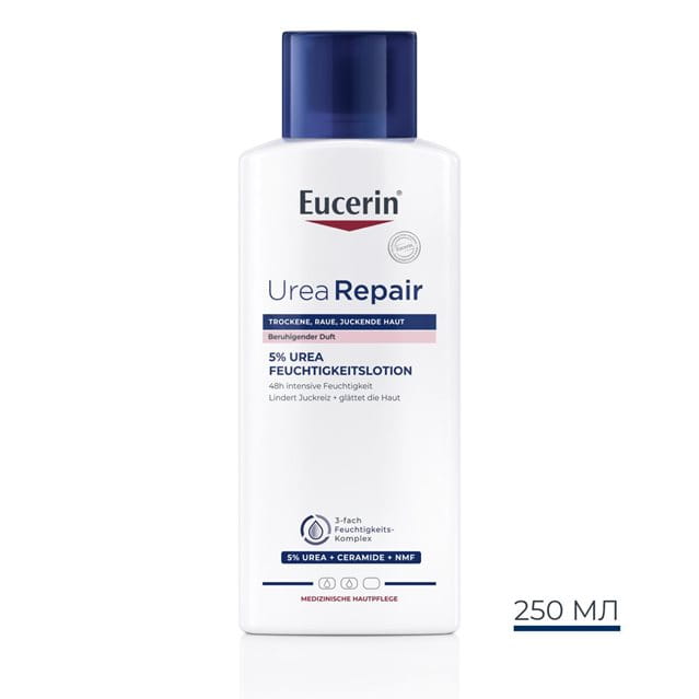 "5% Урея Ріпеір" Зволожуючий лосьйон для сухої шкіри тіла з ніжним парфумом має легкий аромат і лагідні до шкіри інгредієнти, що мають протизапальні властивості. Він не містить парфумів, які, як відомо, викликають алергію. Шкіра інтенсивно зволожена, виглядає та відчувається гладкою та м’якою.